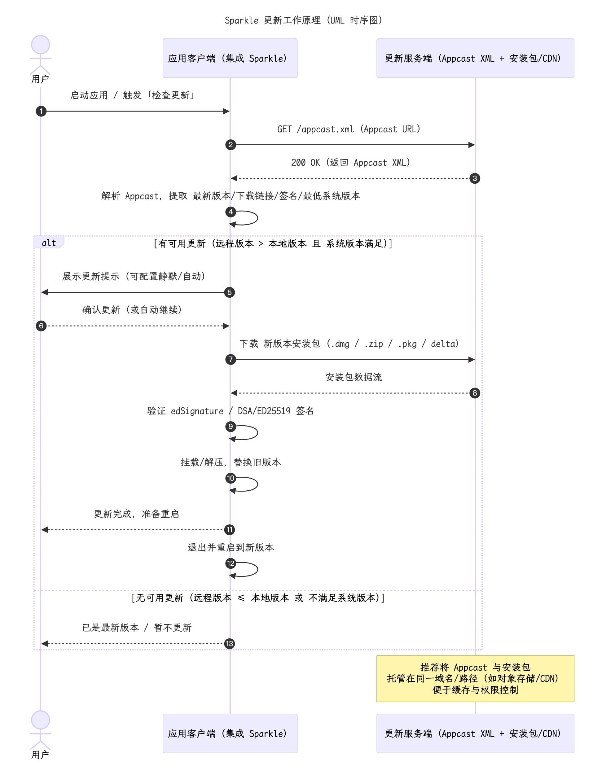 开发者只需维护 Appcast 文件和上传新版本,用户即可享受无缝更新体验。