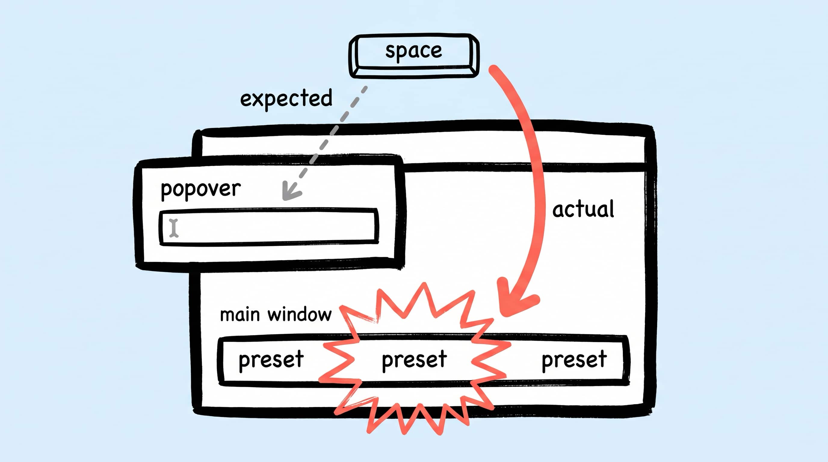 后果是:IME 候选词浮窗是 OS 级别的、跟 key window 无关,所以"看上去候选词正常显示";但 IME 关联的 input context 仍在主窗口某个 control 上,不在 popover 里的 NSTextField 上;@FocusState 也不跨 NSWindow,panel 不是 key window 时它压根没法把 first responder 真正交给 popover 里的 TextField。于是用户按下的空格事件,被路由到了主窗口去——